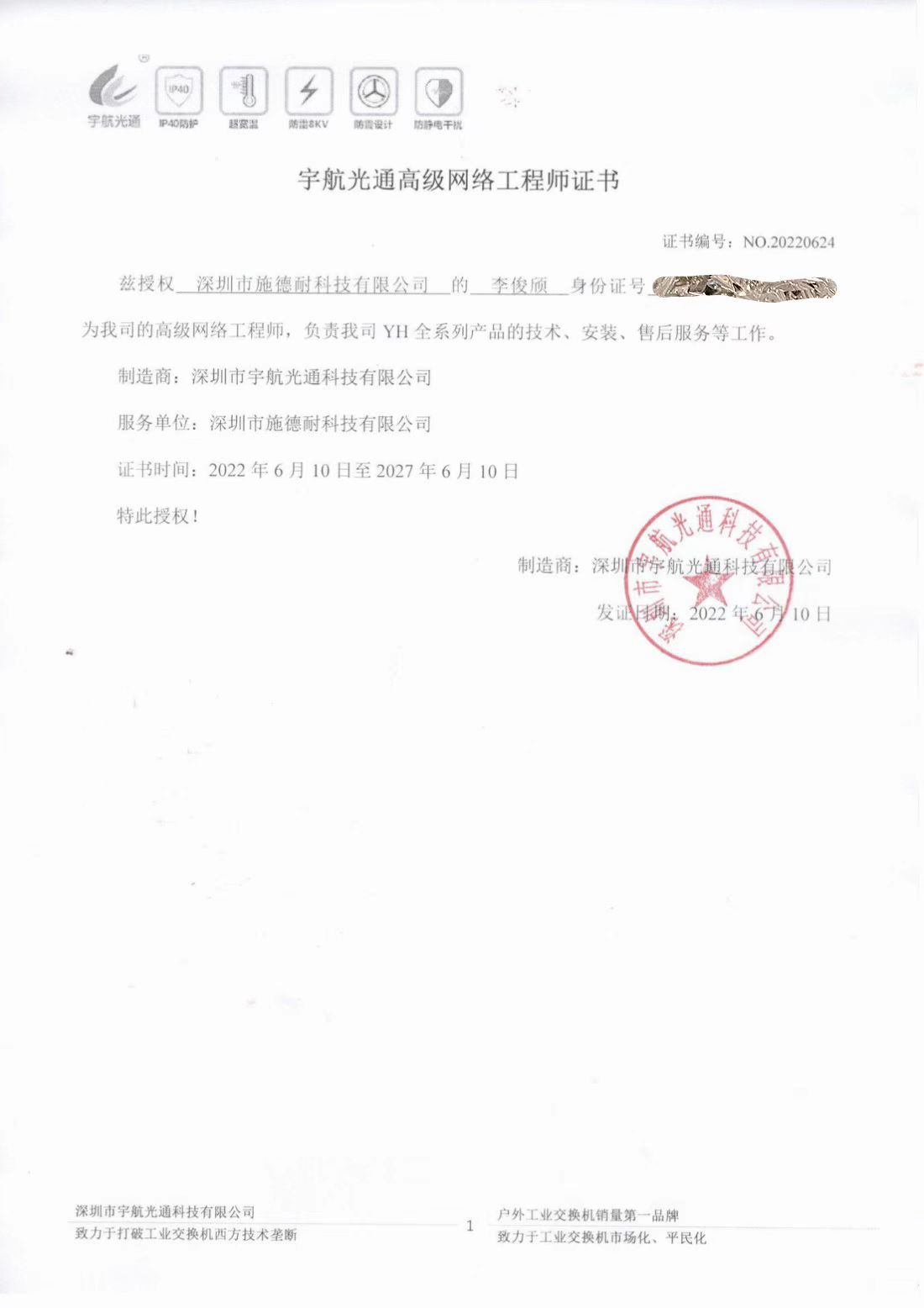 宇航光通高級(jí)網(wǎng)絡(luò)工程師授權(quán)書